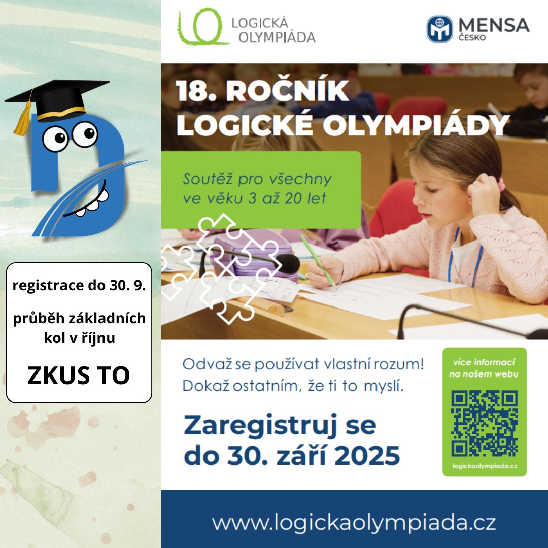 Máte-li zájem, můžete své dítě do 30. 9. 2025 přihlásit na 18. ročník Logické olympiády. Účast mu přinese zajímavou zkušenost. První kolo soutěže probíhá online z pohodlí domova. Podrobnější informace naleznete na webu www.logickaolympiada.cz. |