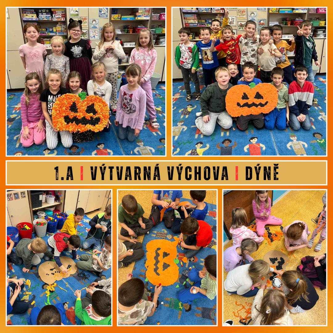| Žáci z 1.A dnes o výtvarné výchově vytvářeli dýně - kluci z papíru a holky z krepáku. Vyzkoušeli si první skupinovou práci a šlo jim to parádně. -KL- |