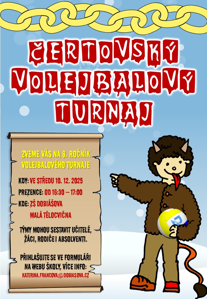 Zveme Vás na již osmý ročník čertovského volejbalu, který se bude konat ve středu 10. 12. 2025. Prezence od 16:30 do 17:00 v malé tělocvičně. Týmy mohou tvořit učitelé, žáci, rodiče i absolventi, přičemž podmínkou je účast alespoň dvou žen v týmu. Každý tým musí mít celkem šest hráčů. Pokud nemáte kompletní sestavu, uveďte v přihlášce jména těch, které již máte. Případně se můžete přihlásit jako jednotlivci.
