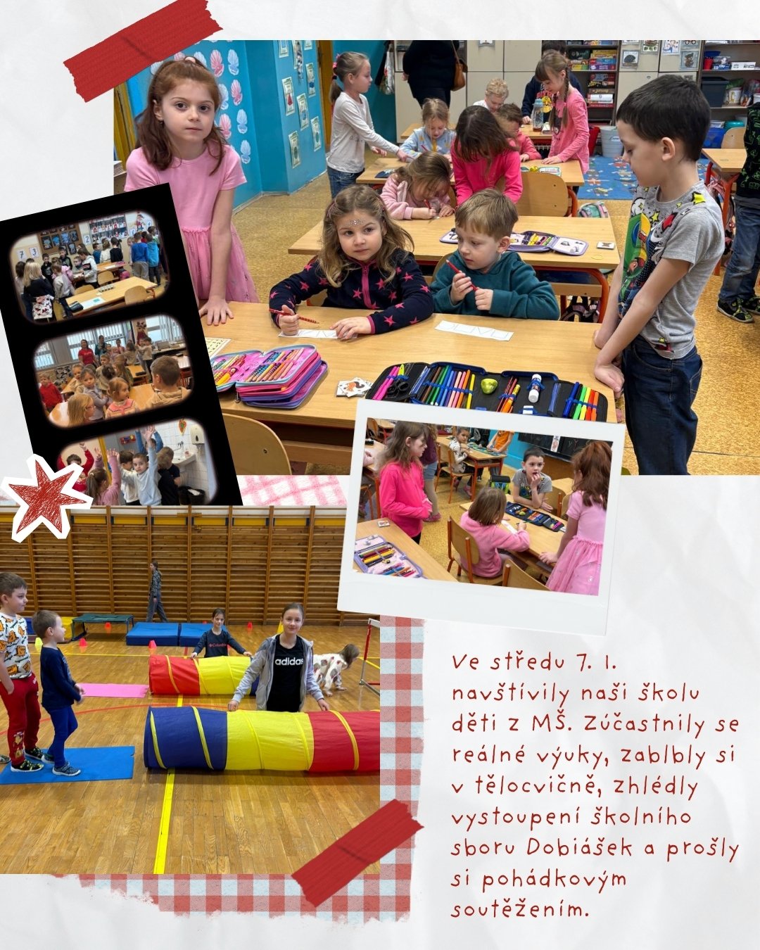 | Ve středu 7. 1. navštívily naši školu děti z MŠ. Zúčastnily se reálné výuky, zablbly si v tělocvičně, zhlédly vystoupení školního sboru Dobiášek a prošly si pohádkovým soutěžením. |