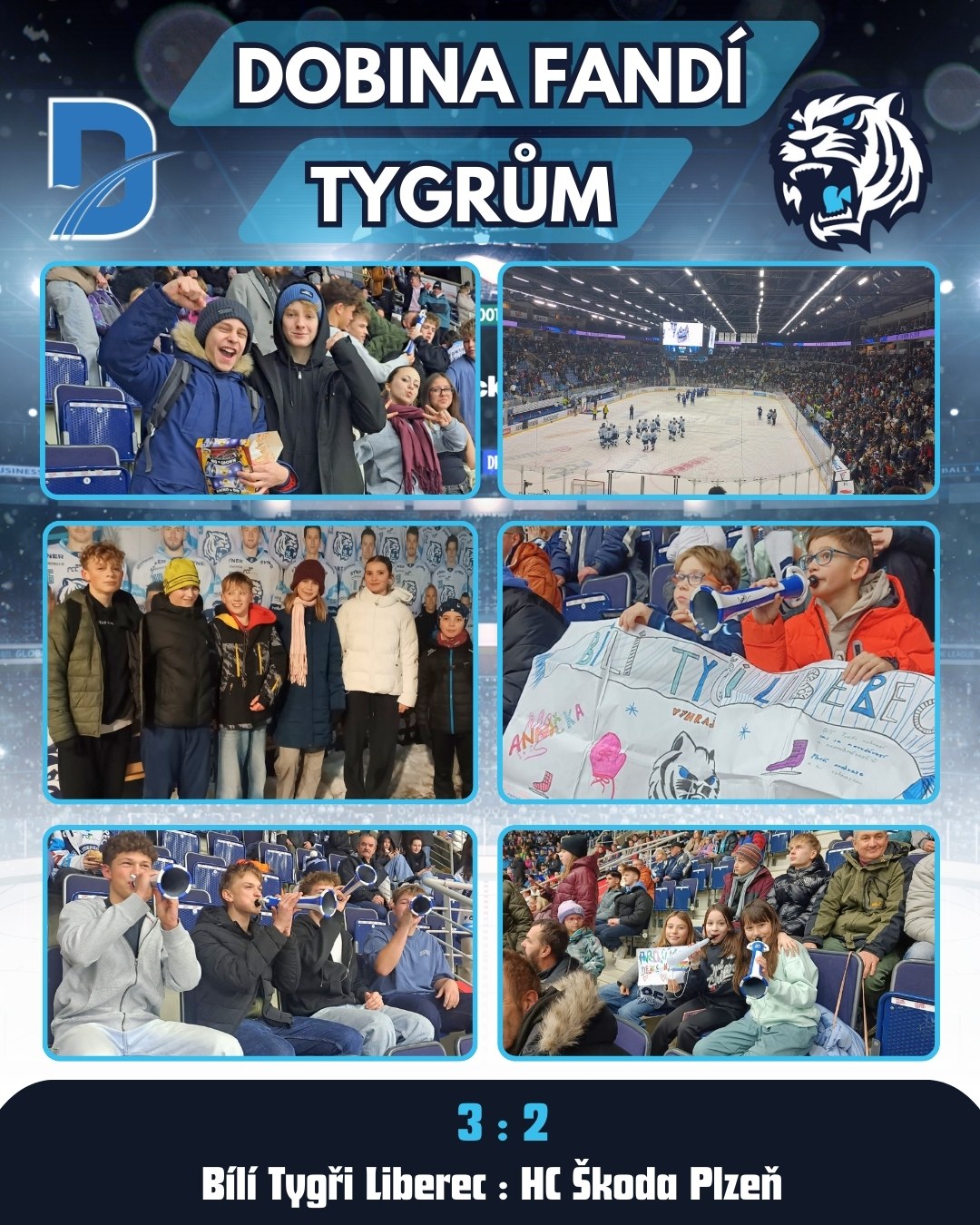 | Dobina opět fandí tygrům! 🥅🏒 V úterý 13. ledna vyrazily třídy I.A a IV.A na hokejové utkání mezi Bílými tygry Liberec a Motorem České Budějovice. Děti z I.A fandily skvěle, dokonce tak, že za to vyhrály pizzu. Všichni si to náramně užili a výsledek zápasu nás moc potěšil. Příště vyrazíme zas! KL, BJ |