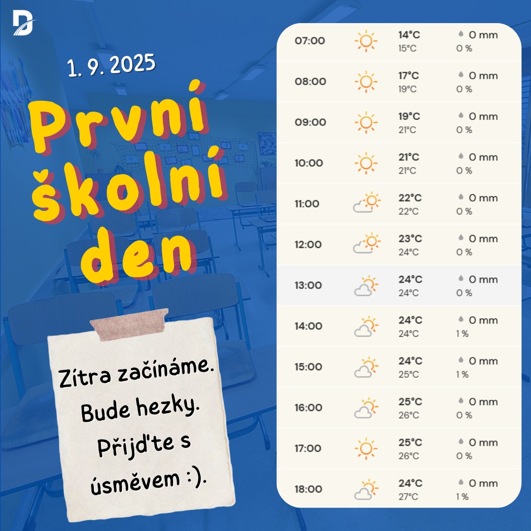 Prázdniny definitivně skončili... v pondělí 1. 9. se šlo klasicky na jednu úvodní hodinu. Venku svítilo sluníčko a léto se ještě nerozloučilo, tak vše bylo hned veselejší :). |