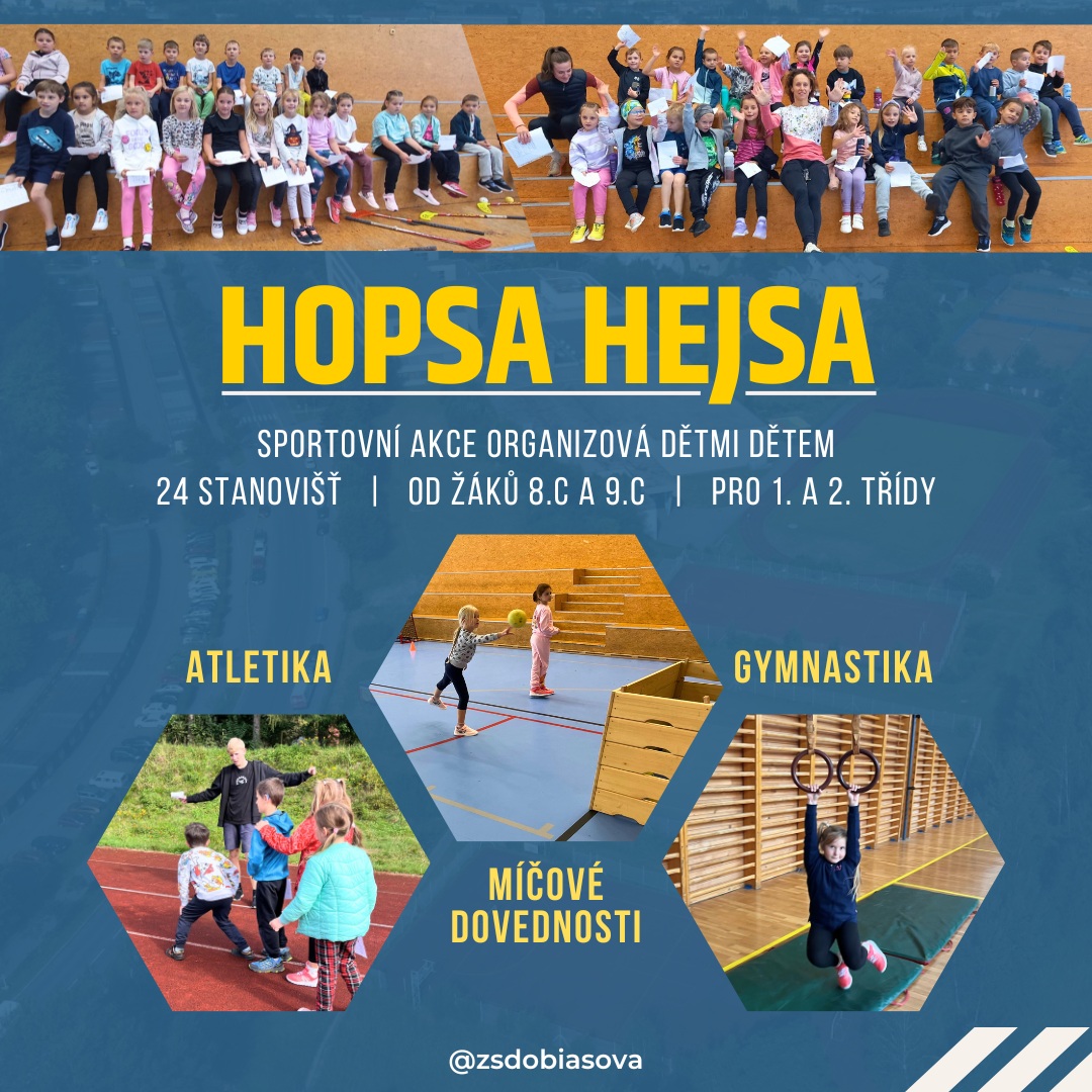Naše 8.C a 9.C se na chvíli proměnily v pořadatele velké sportovní akce Hopsa Hejsa 2025, kdy místo dvou hodin tělocviku připravily pro prvňáčky a druháčky celkem 24 stanovišť – od gymnastických disciplín v tělocvičně, přes míčové hry v hale, až po atletické úkoly venku. Děti si vyzkoušely skok do dálky, běh přes překážky, švihadlo, trampolínu, kladinu, ručkování, florbalovou dráhu i trefování na cíl. Každý výkon se zapisoval do soutěžní kartičky a na závěr byli vyhlášeni nejšikovnější žák a žákyně z každé třídy, kteří si odnesli zaslouženou odměnu. 👏✨ |