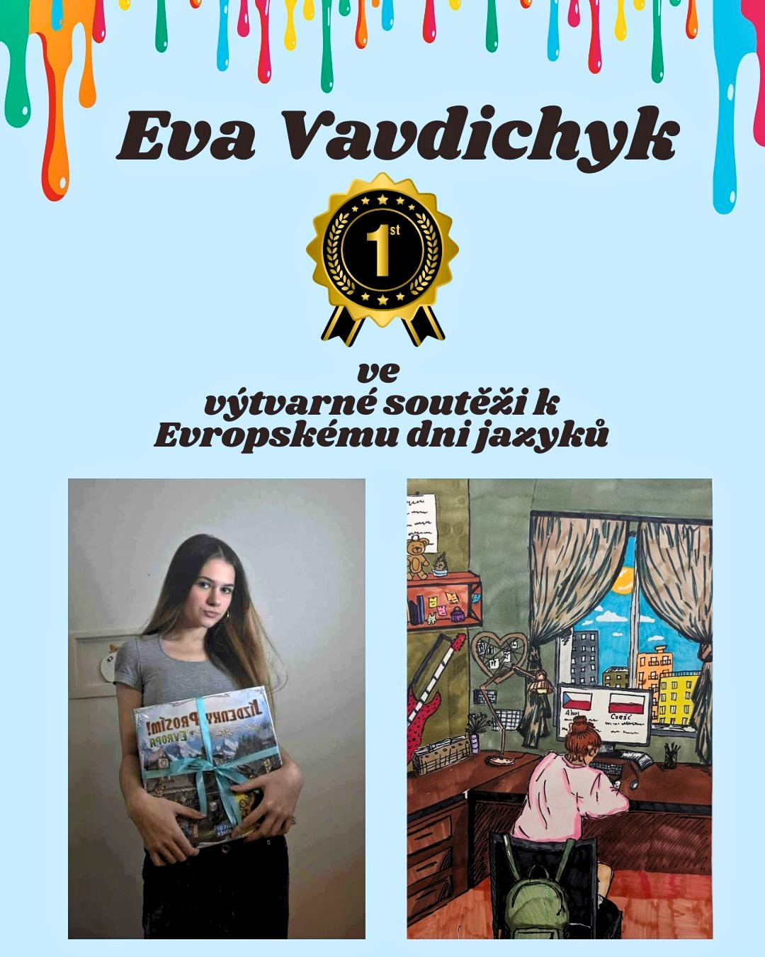 | Naše šikovná žačka Eva Vavdichyk z 9.A zazářila ve výtvarné soutěži k Evropskému dni jazyků a vybojovala 1. místo! 🏆 Odměnou jí byla desková hra Jízdenky, prosím! Evropa. 🚂 Gratulujeme! 👏 |