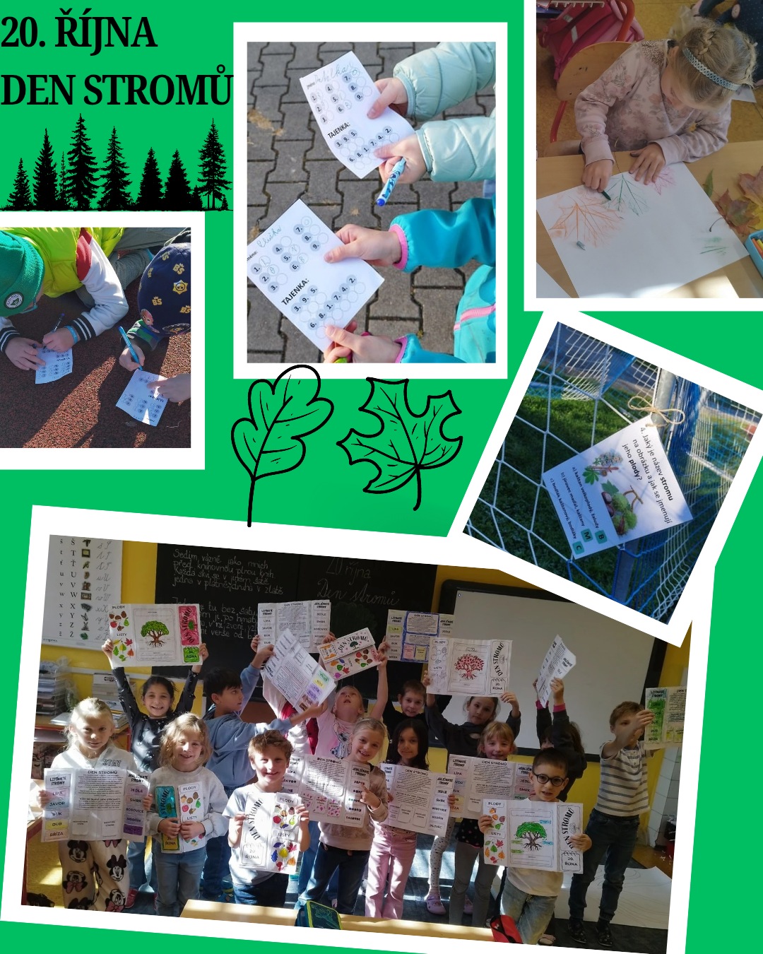 | V pondělí 20. října čekal žáky 2.B projektový den na téma Den stromů. Nejprve jsme se dozvěděli zajímavé informace o stromech a zodpověděli jsme také otázku: Proč jsou stromy důležité? Poté jsme stromy poznávali venku a zároveň plnili zábavné úkoly. Další aktivitou byla výroba lapbooku a tvorba vlastního kouzelného stromu. Na závěr jsme vytvářeli nádherné obrázky pomocí listů technikou frotáže. -DH- |