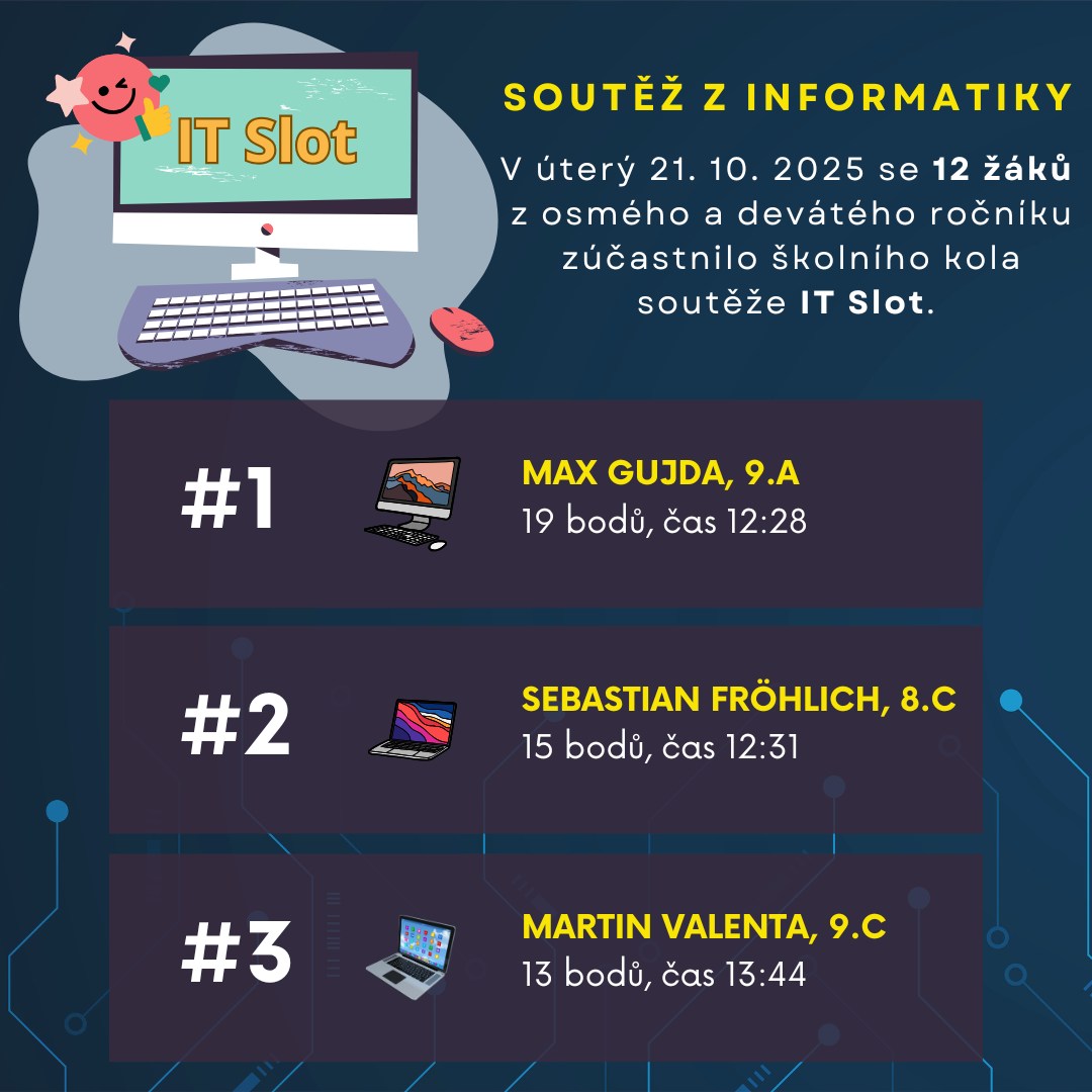 | V úterý 21. 10. se 12 žáků z osmého a devátého ročníku zúčastnilo školního kola soutěže IT Slot. Kvízové otázky prověřovaly teoretické znalosti i logické dovednosti zasahující svým charakterem do předmětu matematika. Gratulujeme trojici nejlepších řešitelů a pochvalu si zaslouží i ostatní, kteří se zúčastnili 💪💪. Pro zajímavost: prvního kola této celostátní soutěže se zúčastnilo 19 306 žáků. Do finálního kola postupuje 50 žáků z celé republiky. Absolutně nejlepší řešitel získal maximálních 25 bodů v čase 11:13. |