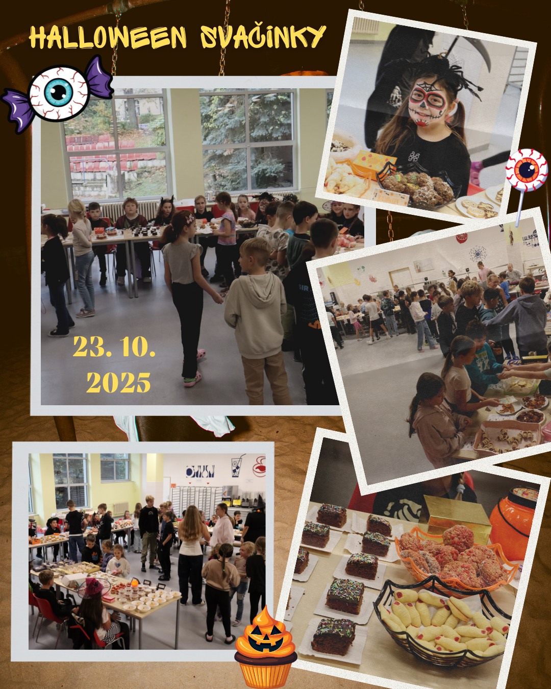 | Žáci 2.B, 3.A a 3.C si připravili sladké i slané svačinky s tématem Halloween. Akce se vydařila a vydělané peníze budou využity na charitativní účely. Děkujeme všem, kteří si nakoupili nějakou dobrotu :-). -VV- |