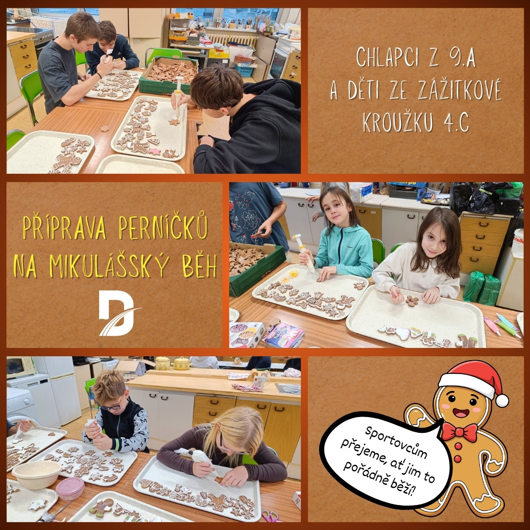 | Příprava perníčků na letošní ročník Mikulášského běhu. Chlapci z 9.A a žáci ze zážitkového kroužku 4.C. |