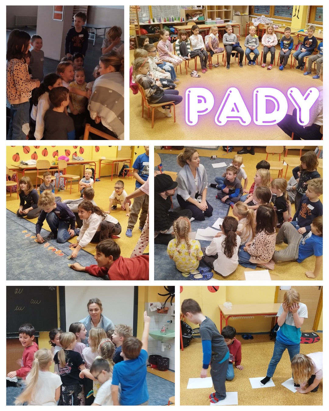 | Do třídy 2. B přišla návštěva z Dramacentra Bezejména s preventivním programem PADY - "tvor, který je jiný a nezapadá". Žáci byli hravou formou vtáhnuti do příběhu, řešili vztah mezi vránou a záhadným tvorem, pomohli Padymu pochopit, že každý má své místo a jinakost není překážkou v přátelství a nakonec společnými silami pomohli medvědovi s návratem domů. -DH- |