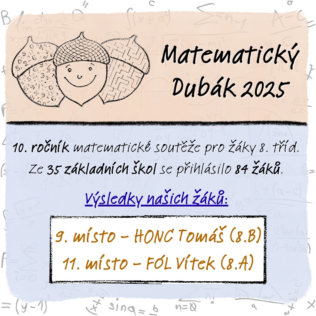 | Dne 3. 12. 2025 se na ZŠ Český Dub uskutečnil 10. ročník soutěže Matematický Dubák, kterého se tradičně účastní žáci 8. tříd. Letos se přihlásilo celkem 84 žáků z 35 základních škol. Děkujeme chlapcům za skvělou reprezentaci školy 👏. |