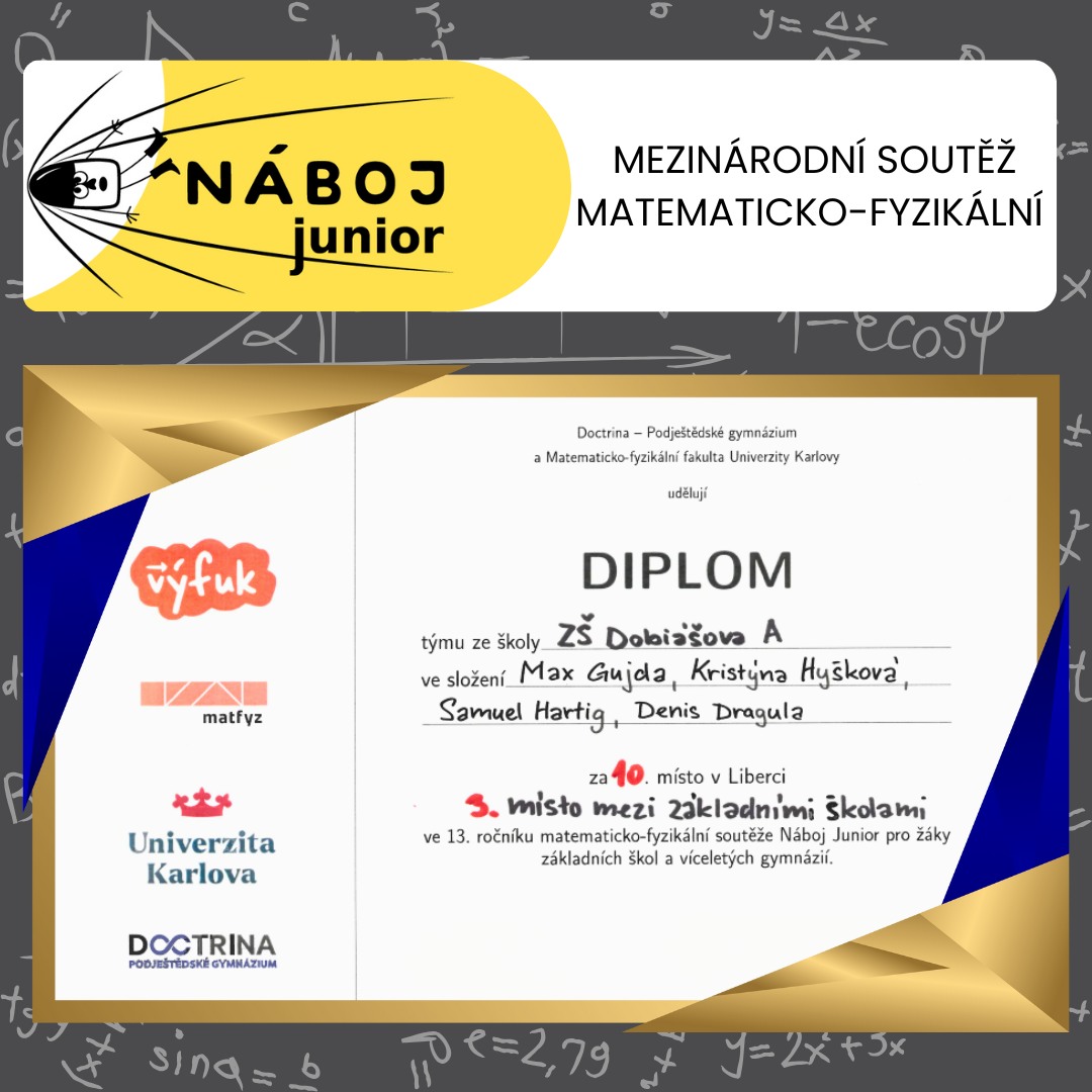 | Dne 21. 11. se konala Mezinárodní matematicko-fyzikální soutěž Náboj Junior 2025 pro čtyřčlenné týmy žáků druhého stupně základních škol a odpovídajících si ročníků víceletých gymnázií. Tým ve složení Max Gujda (9.A), Samuel Hartig (9.A), Kristýna Hyšková (9.B) a Denis Dragula (9.C) vybojoval v Liberci 10. místo (mezi základními školami 3. místo 👏). Ani druhý tým ve složení Matyáš Málek (9.C), Ondřej Kopáček, Eliška Bindová a Zuzana Valentová (všichni z 8.C) si nevedl špatně, umístil se na 17. místě. Gratulujeme a děkujeme za reprezentaci školy. -PS- |