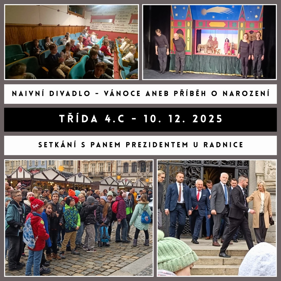 | Dne 10. prosince třída 4.C navštívila v Naivním divadle nové představení "Vánoce aneb Příběh o narození". Po ukončení představení se žáci vydali na náměstí a počkali si před radnicí, aby viděli na vlastní oči pana prezidenta Petra Pavla a první dámu, kteří byli na dvoudenní návštěvě Libereckého kraje. |