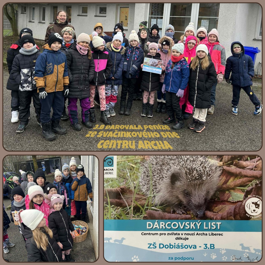 | Třída 3.B dnes 15. 12. předala do záchranné stanice a psího útulku Archa Liberec 4 500 Kč ze Svačinkového dne a vánoční dárky pro opuštěné psy a kočičky. Děkujeme všem, kteří se zapojili a pomohli. Má to smysl. 🐾🎄 |