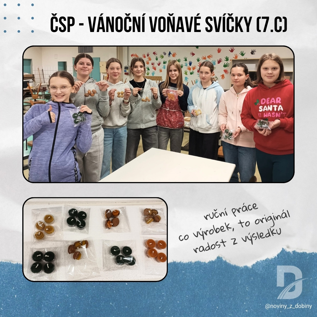 | Tvorba dívek ze 7.C při hodině ČSP s paní učitelkou Bočkovou - voňavé svíčky. |