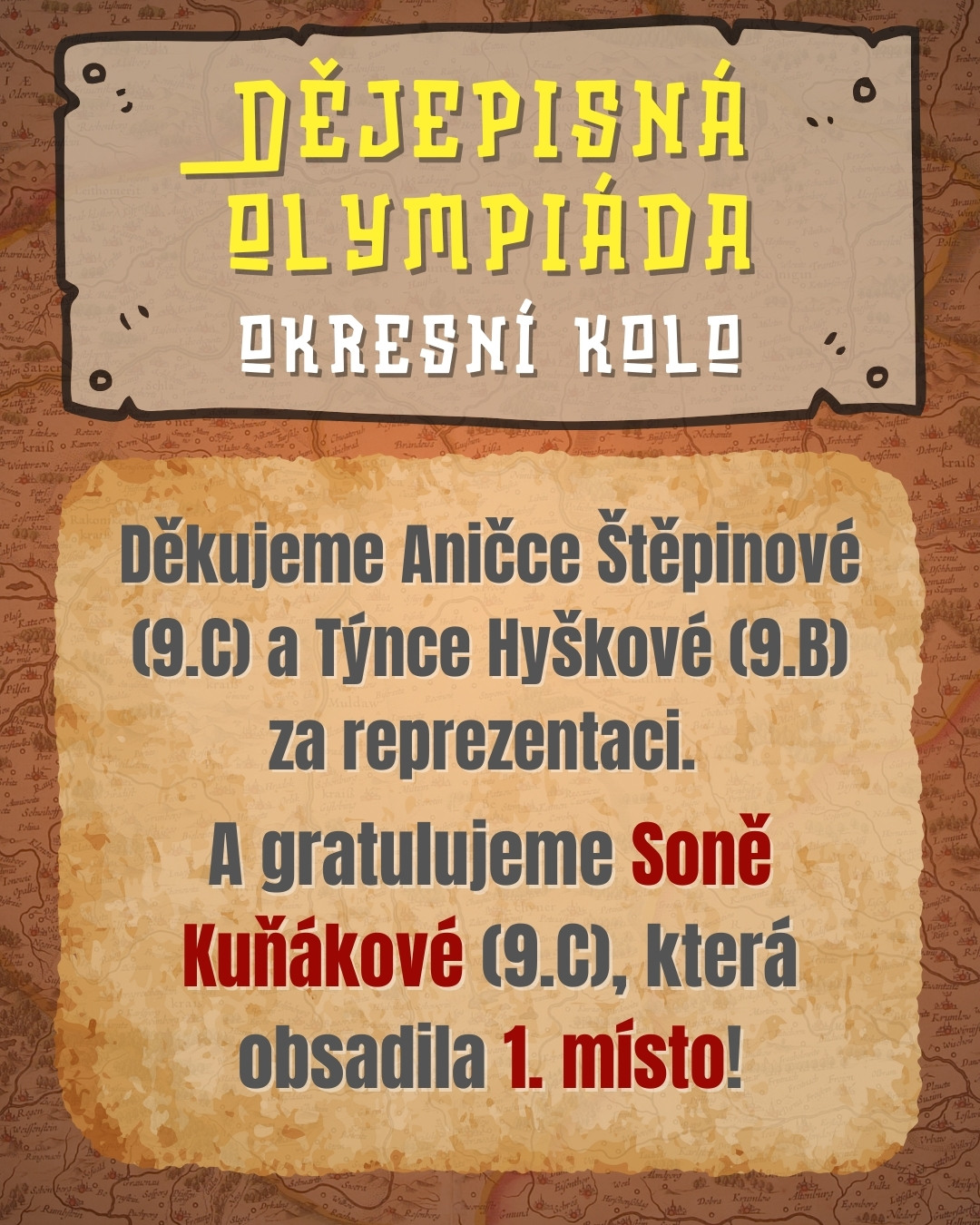 | V pondělí 13. 1. proběhlo okresní kolo dějepisné olympiády. Děkujeme za reprezentaci Aničce Štěpinové (9. C), Týnce Hyškové (9. B) a gratulujeme Soně Kuňákové (9. C), která se umístila na 1. místě. Hodně štěstí do dalšího kola. 🥇 |