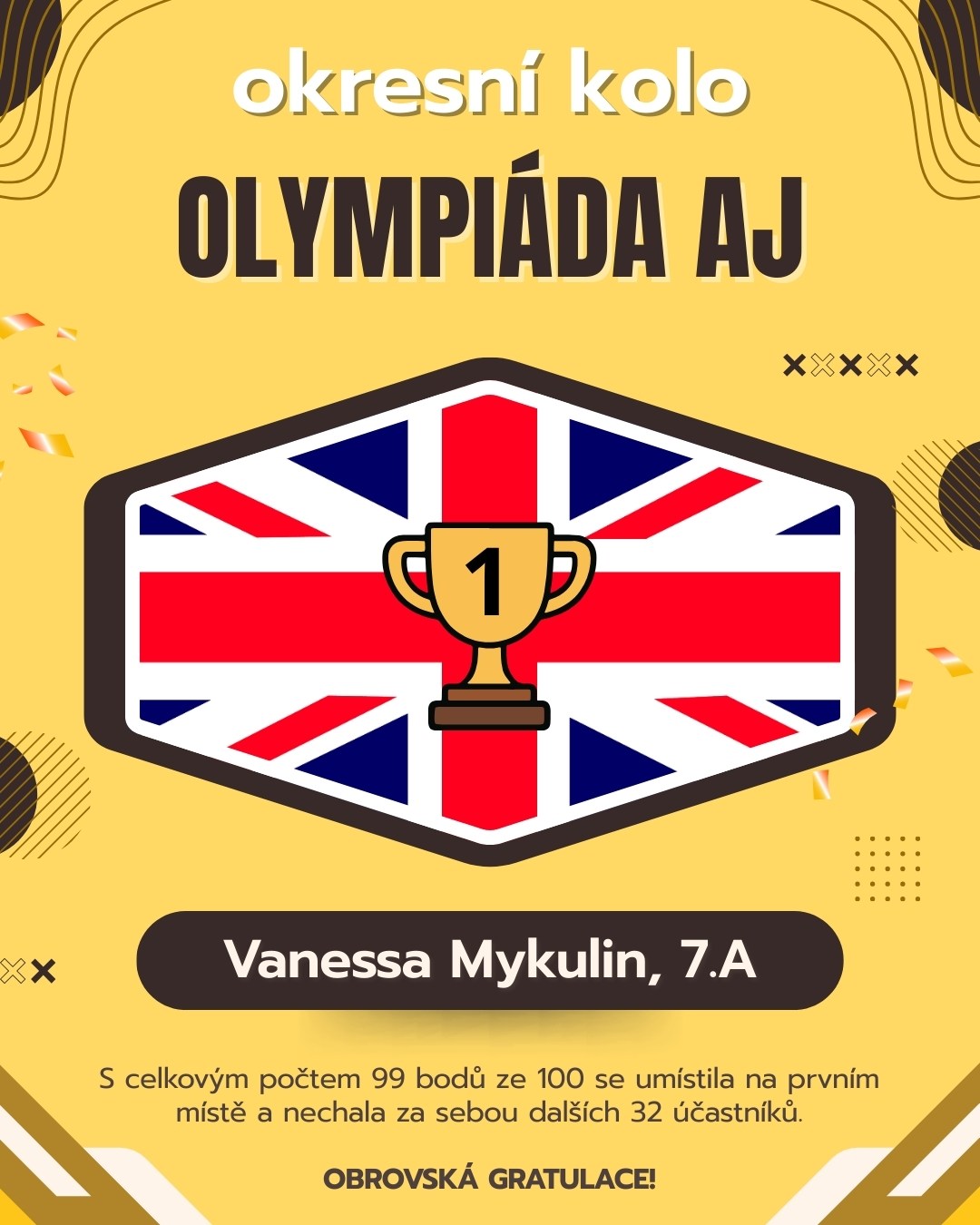 - Vanessa Mykulin, která se umístila na prvním místě s 99 body (maximální počet bodů 100) z 33 účastněných v první kategorii. Vanessa postupuje do krajského kola.